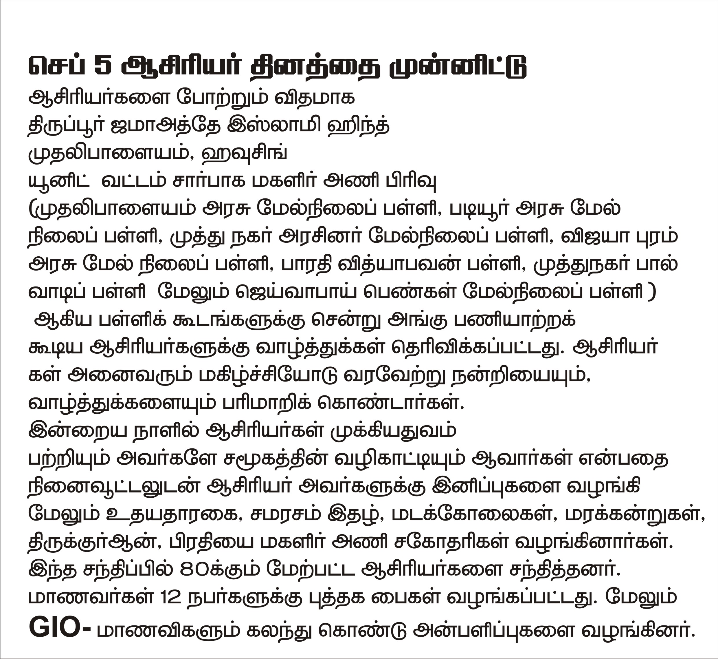 (முதலிபாளையம் அரசு மேல்நிலைப் பள்ளி, படியூர் அரசு மேல்நிலைப் பள்ளி, முத்து நகர் அரசினர் மேல்நிலைப் பள்ளி, விஜயா புரம் அரசு மேல்நிலைப் பள்ளி, பாரதி வித்யாபவன் பள்ளி, முத்துநகர் பால் வாடிப் பள்ளி மேலும் ஜெய்வாபாய் பெண்கள் மேல்நிலைப் பள்ளி ) போன்ற பள்ளிக் கூடங்களுக்குச் சென்று அங்கு பணியாற்றக் கூடிய ஆசிரியர்களுக்கு வாழ்த்து தெரிவிக்கப்பட்டது. ஆசிரியர்கள் அனைவரும் மகிழ்ச்சியோடு வரவேற்று நன்றியையும், வாழ்த்துக்களையும் பரிமாறிக் கொண்டனர்.