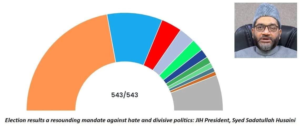 “ஜமாஅத்தே இஸ்லாமி ஹிந்தின் தலைவர் சையத் சஆததுல்லாஹ் ஹுசைனி, தேர்தல் செயல்பாட்டில் தீவிரமாக பங்கேற்றதற்காகவும், அரசியல்வாதிகளுக்கு அவர்களின் வாக்குகள் மூலம் சக்திவாய்ந்த செய்தியை அனுப்பியதற்காகவும் இந்திய மக்களுக்கு தனது வாழ்த்துக்களைத் தெரிவித்துள்ளார். அவர் தேர்தல் முடிவுகளை வெறுப்பு மற்றும் பிளவுபடுத்தும் அரசியலுக்கு எதிரான ‘மகத்தான ஆணையாக வகைப்படுத்தினார்.’
